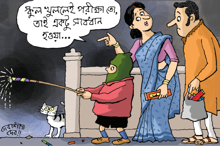 কালীপুজোর দিনে বাজি পোড়ানোর আগে একটি মোটাসোটা মোমবাতি ও একবাক্স দেশলাই বাজির ব্যাগে রেখে দেওয়া হত। বাড়ির ছাদের পাঁচিল এবং বারান্দার রেলিং-এর ওপরটা সরু সরু মোমবাতি দিয়ে টানা সাজানো হত। বাজির স্টকের ব্যাগটা সিঁড়িঘরে কিংবা এমন কোনও জায়গায় এমন সাবধানে রাখা থাকত, যাতে আগুনের ফুলকি কোনও ভাবেই সেটা ছুঁতে না-পারে। ছোটদের বাজি পোড়ানোর সময় বন্ধ-জুতো পরতে হত। গায়ে দিতে হত সুতির জামা আর তার ওপর হাফহাতা সোয়েটার। মাথায় দিতে হত কানঢাকা-টুপি, সে যত গরমই লাগুক-না-কেন! আর হাতে নিতে হত লম্বা পাটকাঠি। যার মাথায় ফুলঝুরি গুঁজে, যথেষ্ট দূর থেকে তাই দিয়ে রকেট, তুবড়ি বা চরকি জ্বালানোর পারমিশন পাওয়া যেত। এই সাবধানতার কারণ আর কিছুই নয়, যদি কোনও কারণে বাজিটা বার্স্ট করে, তার আঁচ যেন হাত বা মুখের ওপর না-পড়ে। আগে পুজোর ছুটির পরেই স্কুলের অ্যানুয়াল পরীক্ষা হত। তাই আমাদের ইনস্ট্রাকশন দেওয়া থাকত বাঁ হাতে করে বাজি জ্বালাবার। মানে, বাঁ হাত যদি কোনও কারণে জখমও হয় ডান হাতে পরীক্ষা দেওয়াটা যেন না আটকায়!