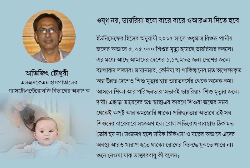 বিশ্বস্বাস্থ্য সংস্থার হিসেব অনুয়ায়ী প্রত্যেকদিন ভারতবর্ষের ৩২১ জন পাঁচ বছরের কম বয়সী শিশু ডায়রিয়ায় আক্রান্ত হয়ে মারা যায়। অথচ একটু সতর্ক থাকলে এই ভয়ঙ্কর ঘটনার এড়ানো যায়।