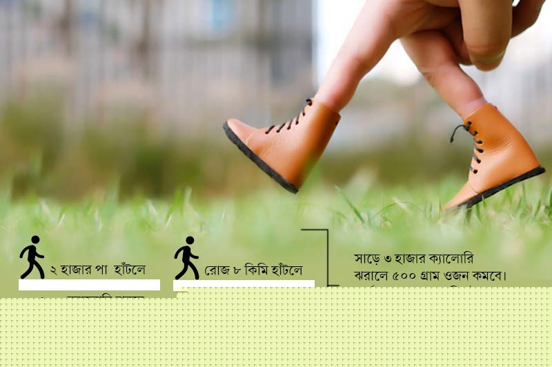 আরও সহজ ভাবে বলতে গেলে ১০০ ক্যালোরি ঝরাতে হলে আপনাকে ২,০০০ পা হাঁটতে হবে। অর্থাত্ প্রায় দেড় কিলোমিটার। বিশেষজ্ঞরা জানাচ্ছেন, সুস্থ থাকতে সপ্তাহে ৫০০ গ্রাম ওজন কমানোই যথেষ্ট। আর এই ৫০০ গ্রাম ওজন কমানোর জন্য আপনাকে ঝরাতে হবে ৩,৫০০ ক্যালোরি। অর্থাত্, যদি সপ্তাহে ৫০০ গ্রাম ওজন কমানো আপনার লক্ষ্য হয়ে থাকে তা হলে আপনাকে প্রতি দিন ৫০০ ক্যালোরি ঝরাতে হবে। যার জন্য রোজ ৮ কিলোমিটার করে হাঁটা প্রয়োজন।