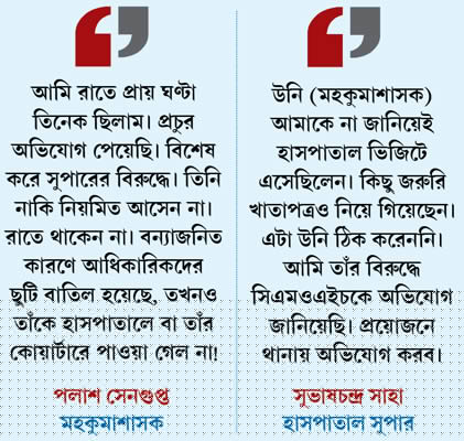 তবে বিষয়টি হজম করতে পারছেন না হাসপাতালের সুপার সুভাষচন্দ্র সাহা। তিনি বলেন, “উনি আমাকে না জানিয়েই ভিজিটে এসেছিলেন। কিছু জরুরি খাতাপত্রও নিয়ে গিয়েছেন। এটা উনি ঠিক করেননি। আমি তাঁর বিরুদ্ধে সিএম ওএইচকে জানিয়েছি। প্রয়োজনে থানায় অভিযোগ করব।” যদিও বুধবার সন্ধ্যা পর্যন্ত বিষ্ণুপুর থানায় এই মর্মে কোনও অভিযাগ দায়ের হয়নি। মঙ্গলবার রাতে তিনি কোথায় ছিলেন? তাঁর দাবি, ‘‘আমি বিষ্ণুপুর শহর থেকে খুব একটা দূরে ছিলাম না।’’