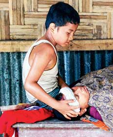 মায়ের শুশ্রূষা। জলপাইগুড়ির মন্ডলঘাটের রানিরকামাত গ্রামে। ছবি: সন্দীপ পাল।