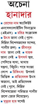 বস্তুত এইএস-অধ্যুষিত এলাকায় ডাক্তারেরা যে কতটা অসহায়, কল্যাণীর ওই চিকিৎসকের মন্তব্যে তারই ছায়া দেখছেন অনেকে। উপসর্গ ভিত্তিক চিকিৎসার যথার্থ পরিকাঠামোও বহু জায়গায় না-থাকায় প্রাথমিক ধাক্কাটাই সামাল দেওয়া যাচ্ছে না। রোগের কারণ বা উৎস চিহ্নিত না-হওয়ায় সরকার কার্যত অকূল পাথারে। নিজেদের অসহায়তা প্রকাশ করে স্বাস্থ্য দফতরের এক কর্তা বলছেন, “পুণে, দিল্লির বিশেষজ্ঞেরা মনে করছেন, পানীয় জল মারফত রোগ ছড়াতে পারে। তাই ওঁরা পরিস্রুত জল সরবরাহে জোর দিয়েছেন। এর বেশি কিছু ওঁরাও জানাতে পারেননি।” এখানকার বিশেষজ্ঞদের কী অভিমত?