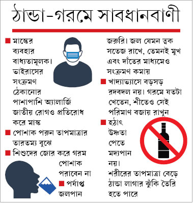 চিকিৎসকেরা জানাচ্ছেন, এই পরিস্থিতিতে এখন সতর্ক না হলে কিন্তু সমূহ বিপদ। তাপমাত্রা বাড়ছে বলেই দ্রুত গরম পোশাক খুলে ফেললে শরীর মানিয়ে নেওয়ার সেই সময়টা পায় না। ফলে হঠাৎ করে যেমন ঠান্ডা লেগে যেতে পারে, তেমনই বাড়তে পারে ভাইরাসে সংক্রমিত হওয়ার ঝুঁকিও। ফলে আর পাঁচটি সতর্কতার সঙ্গেই বাধ্যতামূলক মাস্কের ব্যবহারও।মেডিসিনের চিকিৎসক অরুণাংশু তালুকদারের কথায়, ‘‘মানুষের শরীর ৬-৮ ডিগ্রি পর্যন্ত তাপমাত্রার পার্থক্য নিতে পারে। কিন্তু সেই পার্থক্য যদি এখনকার মতো বাড়তে থাকে, তা হলে বিপদ। হঠাৎ গরম পোশাক খুলে ফেলার বদলে শরীরের তাপমাত্রা বুঝে পদক্ষেপ করা দরকার। আর গরম পড়ল বলেই ঠান্ডা জল খেয়ে ফেললে তো রক্ষা নেই।’’ মেডিসিনেরই আর এক চিকিৎসক অরিন্দম বিশ্বাস আবার বললেন, ‘‘সর্দি-কাশি হওয়া সব ক্ষেত্রে সংক্রমণের লক্ষণ না-ও হতে পারে। হঠাৎ ঠান্ডা বা হঠাৎ গরমের জেরে শরীরের যে সমস্যা হয়, তার বহিঃপ্রকাশও হতে পারে এই সর্দি-কাশি।’’