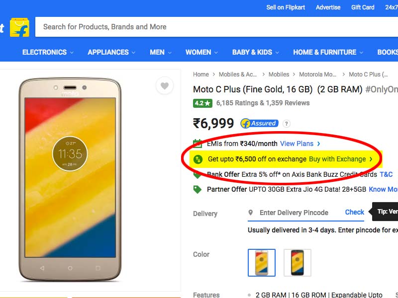 হেডলাইন শুনে হয়ত ভাবছেন, এও কি জিএসটি-র প্রভাব? একদমই না। জিএসটি পরবর্তী কর সংস্কারে বিদেশি মোবাইলের দাম বাড়ার সম্ভাবনাই বরং প্রবল। সেখানে মাত্র ৪৯৯ টাকায় ফ্লিপকার্টে মিলছে সদ্য বাজারে আসা মোটো সি প্লাস। পুরনো মোবাইল এক্সচেঞ্জের মাধ্যমে মোটো সি প্লাস মোবাইলের উপর সর্বোচ্চ সাড়ে ৬ হাজার টাকার ছাড় দিচ্ছে ফ্লিপকার্ট।