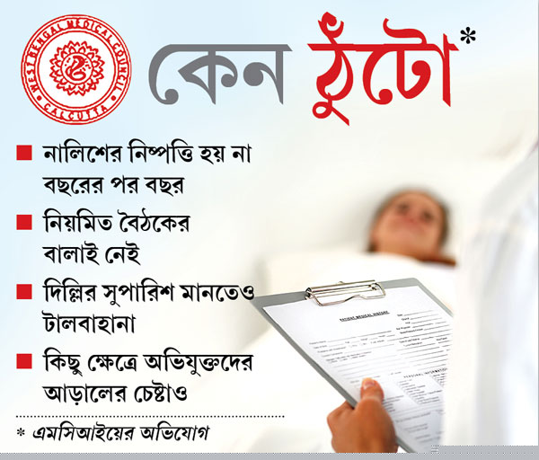 রাজ্যের তরফে শোনার কেউ নেই। তাই চিকিৎসায় গাফিলতির ভুরি ভুরি অভিযোগ নিয়ে এ রাজ্যের মানুষ দলে দলে গিয়ে ভিড় করছেন দিল্লির দরবারে! এবং পরিস্থিতি এমনই দাঁড়িয়েছে যে, নয়াদিল্লির মেডিক্যাল কাউন্সিল অফ ইন্ডিয়া (এমসিআই)-র চোখে রাজ্য মেডিক্যাল কাউন্সিলগুলির মধ্যে পশ্চিমবঙ্গেরটিই এখন সবচেয়ে অকর্মণ্য!
