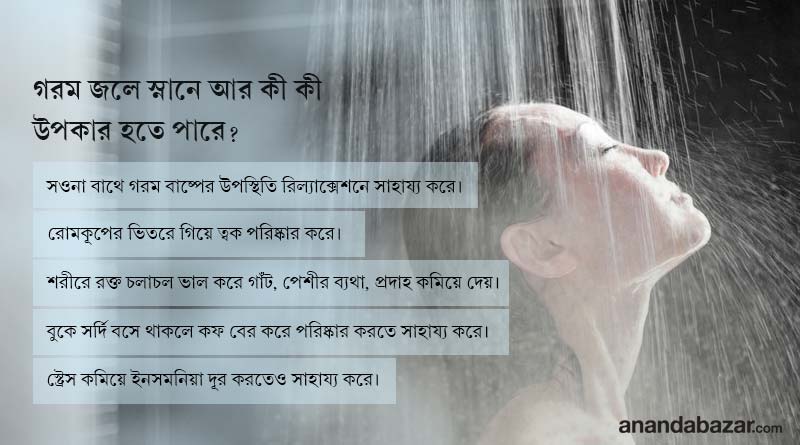 শরীরের মেটাবলিজম উন্নত করে ওজন কমাতে সাহায্য করাতেই আটকে নেই গরম জলে স্নানের উপকারিতা। আমাদের হার্ট, ত্বক ও পেশী সুস্থ রাখতেও সাহায্য করে গরম জলে স্নান।
