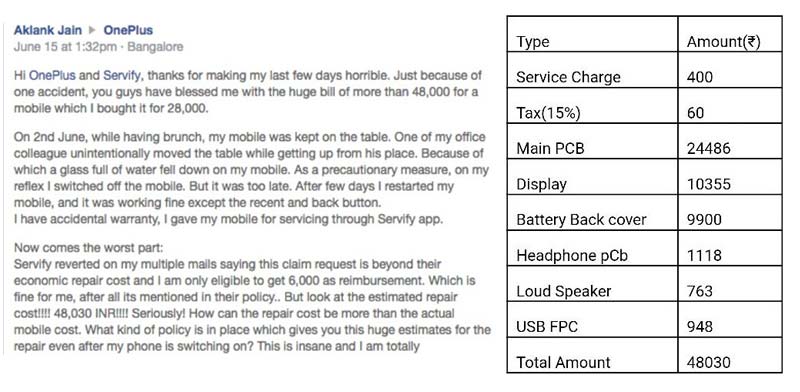 কিছু দিন আগেই ওয়ান প্লাস ৩ মডেলের একটি মোবাইল কিনেছিলেন বেঙ্গালুরুর বাসিন্দা আকলাঙ্ক। অফিসের টেবলের উপর রাখা ছিল ফোনটি। আকলাঙ্কের দাবি, চেয়ার থেকে উঠতে গিয়ে তাঁর সহকর্মীর হাত লেগে এক গ্লাস জল উল্টে গিয়েছিল ফোনটির উপর। সঙ্গে সঙ্গেই ফোনটি সুইচ অফ করে দিয়েছিলেন আকলাঙ্ক। পরে ফোন অন করার পর দেখেন, একমাত্র সেন্ট এবং ব্যাক বোতামটি ছাড়া বাকি মোবাইল ঠিক মতো কাজ করছে।