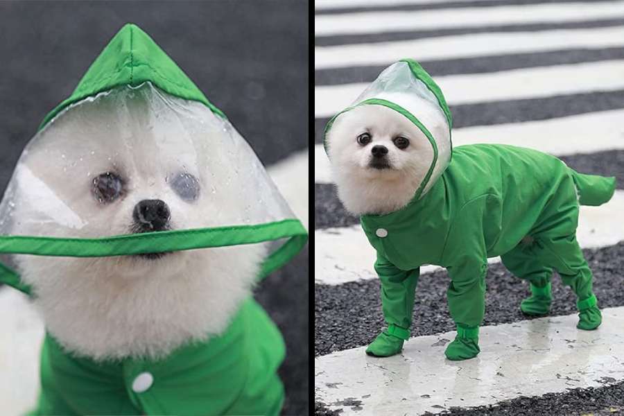 রেন জাম্পস্যুট: পায়ের পাতা থেকে নাকের ডগা পর্যন্ত ঢাকা। অর্থাৎ, বর্ষায় এই বর্ষাতি পরিয়ে পোষ্যকে নিয়ে মর্নিংওয়াক করতে বোরোলেও তার পা ময়লা হওয়ার চিন্তা নেই। উপরন্তু দেখতে যাতে অসুবিধা না হয়, সে জন্য চোখের সামনে দেওয়া স্বচ্ছ প্লাস্টিকের পরত। এই রেনকোট অ্যামাজ়নে পাওয়া যাচ্ছে ২৯৮৯ টাকা।