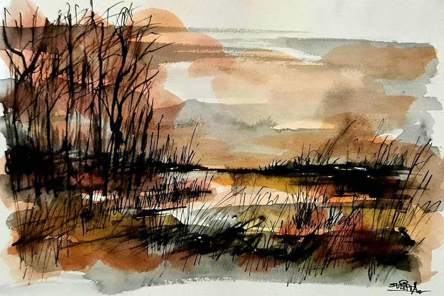 বেশ কয়েকটি জলরঙের ভূদৃশ্যের ছবি প্রদর্শনীতে দেখা গেল। দু’টি ছোট কাজে জলরঙে সামান্য একটু বার্ন্ট সিয়েনা, একটু ইয়েলো অকার, অল্প নীল এবং গভীরতা আনার জন্য কালো রঙের টানে সুন্দর ভাব প্রকাশ পেয়েছে। এ ছাড়া আরও দু’টি জলরঙের কাজে বিশেষ কোনও রঙের প্রাধান্য নেই। কালো রঙের বিভিন্ন টোনে জলাশয়, দূরে নদী এবং কাছে দৃশ্যমান সরু সরু পাতাবিহীন আকাশছোঁয়া গাছ। আর একটি ছবিতে কাছাকাছি বেশ কিছু গাছ এবং পটভূমিতে হালকা ভাবে রঙিন আকাশ। ভারী মনোরম। যদিও এই ছবিগুলি প্রায় একরঙা।