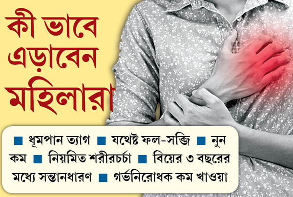 এ রকম কিছু লক্ষ্য করলেই চিকিৎসকের পরামর্শ নিতে হবে। এর পাশাপাশি ধূমপান ত্যাগ, পরিমিত আহার (কম ফ্যাট এবং মাপমতো কার্বোহাইড্রেট যুক্ত খাবার খাওয়া), এবং নিয়মিত ব্যায়াম দূরে রাখবে হার্ট অ্যাটাককে। এ ছাড়াও বিয়ের তিন বছরের মধ্যে সন্তান এবং যতটা কম সম্ভব গর্ভনিরোধক ওষুধের ব্যবহার মহিলাদের হার্ট অ্যাটাকের আশঙ্কা কমাবে বলে মনে করছেন চিকিৎসকরা।