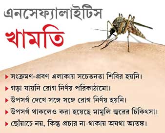 পুণে ও দিল্লির জীবাণুবিজ্ঞানীদের সঙ্গে এ দিন জলপাইগুড়িতে স্বাস্থ্য দফতরের অফিসারদের বৈঠকে যে-সব বিষয় উঠে এসেছে, তার মধ্যে আছে অন্তত তিনটি ‘নেই’। সেগুলি হল: i জলপাইগুড়ি জেলা এনসেফ্যালাইটিস-প্রবণ হওয়া সত্ত্বেও এখানে সর্বস্তরের মানুষকে এই রোগ সম্পর্কে সচেতন করা যায়নি। i জাপানি এনসেফ্যালাইটিসের উপসর্গ দেখা গেলে মানুষ কোথায় যাবেন, সেই সম্পর্কে কোনও ধারণাই নেই কারও। i কোথায় কোথায় রক্ত পরীক্ষা করা হয়, সেই বিষয়ে সরকারি স্তরে কোনও প্রচার নেই। আর এই সব ‘নেই’ মিলে পরিস্থিতি অনেকটাই হাতের বাইরে চলে গিয়েছে।