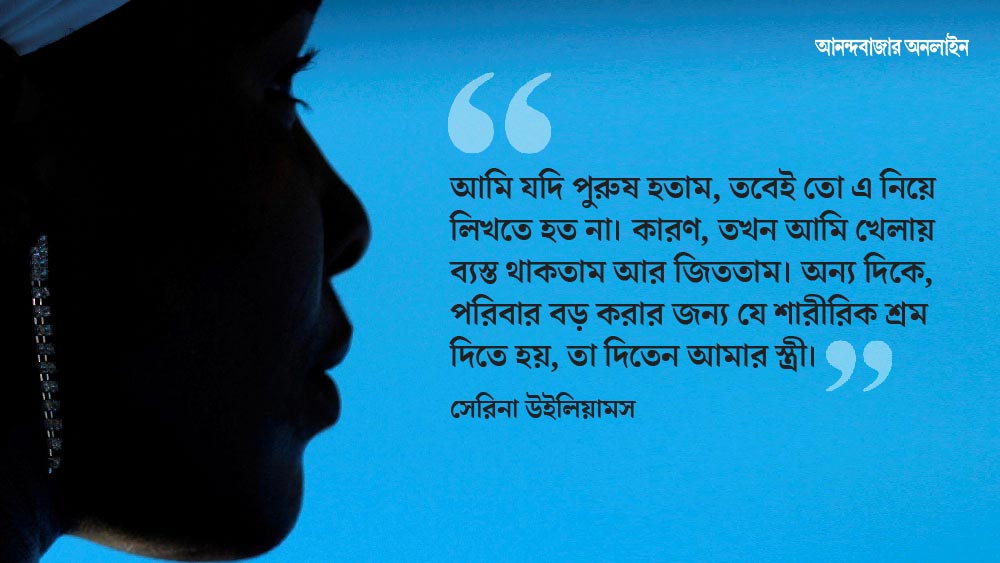 আমার সেই সহকর্মী তবু ছ’মাস পর অফিসে ফিরেছিলেন। সেরিনা তো আর কখনও খেলার মাঠে ফিরবেন না। নিজের অবসরের সিদ্ধান্তের ঘোষণা করার সময় বলেছেন, টেনিস ও পরিবারের মধ্যে কোনও একটিকে বেছে নিতে হবে, এমন চাননি। কিন্তু বাধ্য হয়েছেন নিতে। বলেছেন, ‘‘এটা তো হওয়া উচিত নয়। আমি যদি পুরুষ হতাম, তবেই তো এ নিয়ে লিখতে হত না। কারণ, তখন আমি খেলায় ব্যস্ত থাকতাম আর জিততাম। অন্য দিকে, পরিবার বড় করার জন্য যে শারীরিক শ্রম দিতে হয়, তা দিতেন আমার স্ত্রী।’’ অর্থাৎ, পুরুষ হলে কোনওটিই ছাড়তে হত না। সবই পাওয়া যেত।