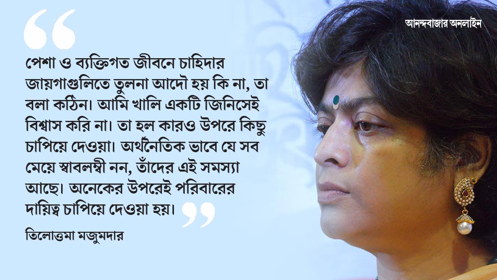 সকলে অবশ্য বিষয়টি একই ভাবে দেখেন না। যেমন লেখক তিলোত্তমা মজুমদার মনে করেন, ছেলেদের আর মেয়েদের প্রাপ্তি ও ভাবে দাঁড়িপাল্লায় মাপা যায় না। ঠিক যেমন মাপা যায় না তাঁদের দায়িত্বও। তাঁর কথায়, ‘‘মা ও সন্তানের আলাদা যোগাযোগ থাকে। সেই প্রাপ্তি মায়েরই।’’ ফলে মাতৃত্ব একেবারেই ব্যক্তিগত সিদ্ধান্ত। পেশাগত দায়িত্বকে কে কতটা প্রাধান্য দেবেন, তা তো তিনিই ঠিক করেন। তিলোত্তমার বক্তব্য, ‘‘পেশা ও ব্যক্তিগত জীবনে চাহিদার জায়গাগুলিতে তুলনা আদৌ হয় কি না, তা বলা কঠিন। আমি খালি একটি জিনিসেই বিশ্বাস করি না। তা হল কারও উপরে কিছু চাপিয়ে দেওয়া। অর্থনৈতিক ভাবে যে সব মেয়ে স্বাবলম্বী নন, তাঁদের এই সমস্যা আছে। অনেকের উপরেই পরিবারের দায়িত্ব চাপিয়ে দেওয়া হয়। কিন্তু যিনি স্বাবলম্বী, তাঁরা অনেকেই সিদ্ধান্ত নিতে পারেন। তিনি কী ভাবে নিজের পরিবারের দেখভাল করবেন, তা তাঁর একান্তই ব্যক্তিগত সিদ্ধান্ত। তার পক্ষে বা বিপক্ষে কারও মত দেওয়ার থাকে কি?’’