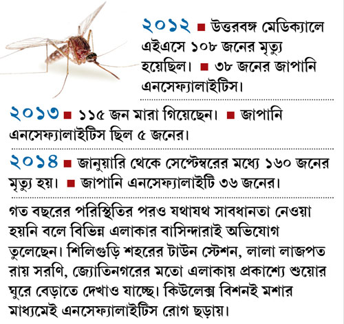 গত বছর উত্তরবঙ্গ মেডিক্যাল কলেজ হাসপাতালে, অন্তত ১৬০ জনের মৃত্যু হয়েছিল। রাজ্য জুড়ে তা নিয়ে হইচই পড়ে। তথ্য গোপনের অভিযোগে মেডিক্যাল কলেজ হাসপাতালের সুপার এবং জলপাইগুড়ি এবং দার্জিলিং জেলার মুখ্য স্বাস্থ্য আধিকারিককে সাসপেন্ড করা হয়। পরে সাসপেন্ড হন উত্তরবঙ্গ মেডিক্যাল কলেজ হাসপাতালের তৎকালীন অধ্যক্ষ-ও। এ বছর পরিস্থিতি মোকাবিলায় মাসখানেক আগেই উত্তরবঙ্গের আলিপুরদুয়ারের ৪ টি ব্লক, দার্জিলিং জেলার নকশালবাড়ি এবং মাটিগাড়া ব্লক এবং জলপাইগুড়ির দুটি ব্লকে অন্তত ১০ লক্ষ বয়স্ক বাসিন্দাকে এনসেফ্যালাইটিসের প্রতিষেধক দেওয়া হয়েছে। তবে এর পরেও এনসেফ্যালাইটিসের উপসর্গ নিয়ে উত্তরবঙ্গের বিভিন্ন জেলা থেকে উত্তরবঙ্গ মেডিক্যালে রোগীরা আসছেন। অন্তত ৫ জন রোগী এখন উত্তরবঙ্গ মেডিক্যালে ভর্তি রয়েছেন। তাঁদের রক্ত পরীক্ষার জন্য পাঠানো হয়েছে বলে কর্তৃপক্ষ জানান।