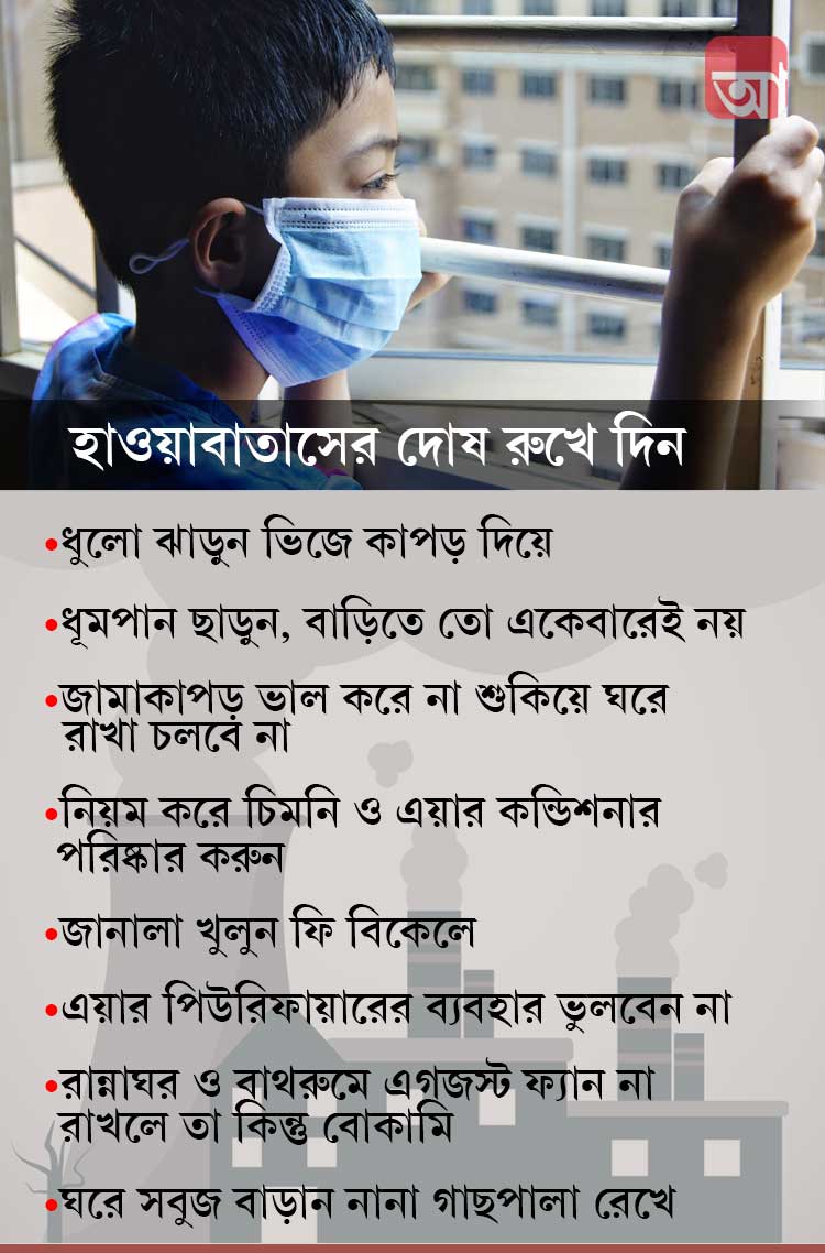 প্রথমেই নিজের কিছু ভুল শুধরে নিন। বাড়ির ভিতর ধূমপান করার অভ্যাস থাকলে আগে তা বর্জন করুন। তামাকের ধোঁয়ায় থাকা ক্ষতিকারক উপাদান শ্বাসযন্ত্রের সরাসরি ক্ষতি করে। তাই ধূমপান চাড়তেই হবে। বিশেষ করে ঘরের মধ্যে ভারী পর্দা বা কার্পেট থাকলে ধূমপান থেকে হওয়া দূষণ সে সবের গায়ে আটকে যায়। বাড়ির অন্য সদস্যরাও শিকার হন সেকেন্ড হ্যান্ড বা থার্ড হ্যান্ড স্মোকিংয়ের। রান্না ঘর ও বাথরুমে এগজস্ট ফ্যান থাকা আবশ্যিক। স্নান, পরিষ্কার-পরিচ্ছন্ন হওয়া, কাচাকুচি ইত্যাদির কারণে বাথরুমের বাতাসে দূষণ থাকে, তাকে বাইরে বার করে বাইরের ঠান্ডা ও তুলনামূলক শুদ্ধ হাওয়া ভিতরে প্রবেশ না করালে তা ক্ষতি করবে শরীরের। রান্না ঘরেও তেল-মশলার গন্ধ, ধোঁয়া বাইরে বেরতে না পারলে ঘরের ভিতরের বাতাসকে ভারী করে দেবে ও শ্বাসের সঙ্গে শরীরে প্রবেশ করে ক্ষতি করবে। তাই রান্নাঘরে চিমনি রাখার চেষ্টা করুন। একান্ত তা না থাকলে জানালা খুলে রান্না করুন, যাতে ধোঁয়া-দূষণ কিছুটা বাইরে বেরতে পারে। কেবল চিমনি থাকলেই হবে না। নিয়মিত রান্নাঘর পরিষ্কার রাখার সঙ্গে চিমনিও পরিষ্কার করুন। আজকাল অনেক অটো ক্লিন চিমনি বাজারে এসেছে। সুবিধা বুঝে কিনতে পারেন সে সবও। কেবল চিমনিই নয়, এয়ার কন্ডিশনকেও নিয়মিত পরিষ্কার রাখুন। এসি-র ভিতরে ধুলো ও কার্বন জমলেও ঘরের বাতাস অশুদ্ধ হতে পারে।
