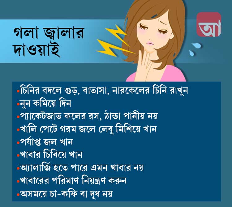 গলা জ্বালা বা চোঁয়া ঢেকুরের উপদ্রব ঠেকাতে খাবার থেকে আজই বাদ দিন চিনি। পারলে গুড় বা গুড়ের বাতাসা দিন তার পরিবর্তে। নারকেলের চিনি ব্যবহার করতে পারলেও ভাল। যতটা নুন এখন খান, তার চেয়ে ২ গ্রাম মতো কমিয়ে দিন রোজের খাবার থেকে। কেবল তেল-মশলাই নয়, অতিরিক্ত নুন গ্যাস-অম্বলের জন্য দায়ী। অসময়ে চা-কফি অনেক ক্ষেত্রে অম্বল ডেকে আনে। বিশেষ করে বয়স বাড়লে যখন-তখন চা-কফি খাবেন না। অনেক সময় দুধ-চা থেকে অনেকের সমস্যা আসে। তেমন হলে লিকার চা খাওয়া অভ্যাস করুন। খিদে পেলে অনেকটা খেয়ে ফেলা আমাদের স্বভাব। খিদে পেলে বা নিমন্ত্রণ বাড়িতে খেতে বসার আগে এক গ্লাস জল খেয়ে নিন। এতে পেটে অনেকটা জায়গা কমে যায়, ফলে অনেক খাবার খেয়ে ফেলার প্রবণতা কমে। ভাল করে চিবিয়ে খাবার খান। তাড়াহুড়োয় ভাল করে না চিবনোর ফলে ভাল করে হজম হয় না খাবার। এতে অম্বলের প্রবণতা বাড়ে। কোনও ধরনের খাবারে অ্যালার্জি থাকলে তা এড়িয়ে চলুন। বেশি রাতে দুধ বা ফল খাবেন না।