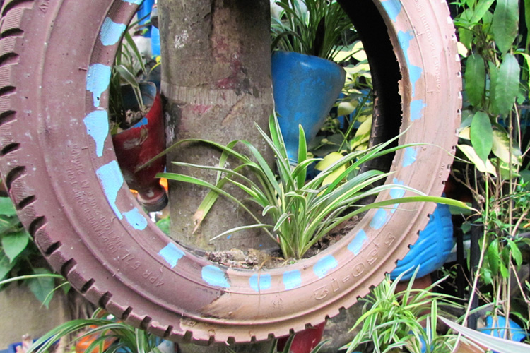 পুরনো টায়ারের মধ্যে লাগানো গাছ
