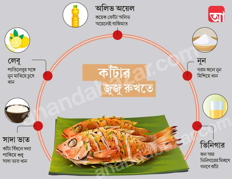 মাছে-ভাতে বাঙালির খাবার পাতে মাছ ছাড়া চলে না। কাঁটা বেছে মাছ খাওয়া এক শ্রেণির কাছে ঝঞ্ঝাটের হলেও ভোজনরসিক বাঙালি তাকে দিব্য সামলে নিয়েছে। সাধারণত, মাছ খেতে অভ্যস্ত যাঁরা, ভাল করে মাছ বেছে খাওয়ার কৌশলও তাঁরা রপ্ত করে ফেলেন প্রথম থেকেই। তবু বেকায়দায় গলায় মাছের কাঁটা বিঁধে যাওয়া খুব বিরল ঘটনা নয়। বরং তাড়াহুড়োয় প্রায়ই এমন সমস্যার সম্মুখীন হন অনেকে।
