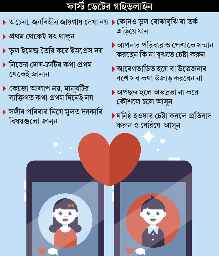 প্রথমেই এমন একটা জায়গা বাছুন, যা আপনার চেনা এলাকার মধ্যে পড়ে ও জনবহুল। খুব ফাঁকা এলাকা, হোটেলের ঘর, বা অচেনা জায়গা দেখা করার জন্য বাছবেন না। পারলে ওই এলাকায় বিপদে পড়লে আপদকালীন কিছু ফোন নম্বর ফোনে মজুত রাখুন। প্রথম থেকেই সৎ থাকুন। নিজের সম্পর্কে এমন কিছু বলবেন না যা বিশ্বাসযোগ্য নয়। অকারণ মিথ্যা বলে ইমপ্রেস করারও চেষ্টা করবেন না। আপনি যেমন ঠিক সে ভাবেই নিজেকে তুলে ধরুন সঙ্গীর সামনে। এতে ভবিষ্যতে এ সম্পর্ক এগোলে জটিলতা আসবে না। প্রথম দিনই কথাবার্তার মাঝে নিজের কিছু স্বভাবগত ভুলের কথা বলে রাখুন। এতে আপনাকে বুঝতে সুবিধা হবে তাঁর। প্রথমেই মনে রাখতে হবে, দীর্ঘ দিনের আলাপ বা বন্ধুত্ব থেকে হওয়া প্রেমের যে ধরন, তার চেয়ে এই ধরনের আলাপ প্রকৃতিগতভাবেই বেশ আলাদা। তাই যদি সত্যিই এই সাক্ষাৎ থেকে কোনও সম্পর্ক তৈরির কথা ভাবেন, তা হলে খুব ছোট ছোট কেজো আলাপের বদলে এমন কোনও বিষয় নিয়ে কথা বলুন, যাতে সেই মানুষটির জীবনের বিশ্বাস, আদর্শ, শখ এ সব সম্পর্কে জানতে পারেন। প্রথম থেকেই আলাপে জড়তা কাটিয়ে এমন ভাবে কথা বলুন যেখানে কেবল নিজেদের কথাই নয়, সমাজ, রাজনীতি, চার পাশের কোনও গুরুত্বপূর্ণ ঘটনাও উঠে আসবে আলাপে। এতে মানুষটি সম্পর্কে ধারণা আরও স্বচ্ছ হবে।