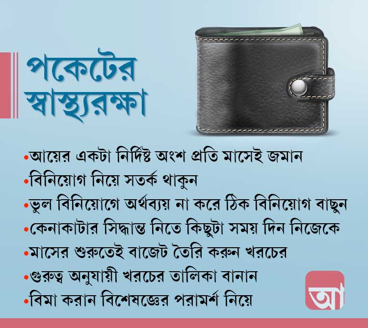 প্রথমেই মনে রাখতে হবে, আয়ের একটা নির্দিষ্ট অংশ প্রতি মাসেই জমাতে হবে আপনাকে, তা সে যত কমই হোক না কেন। তাই মাসের শুরুতে নিজের বাজেট বুঝে আগেই ব্যাঙ্কে রাখুন সেই পরিমাণ টাকা। বিশেষ পরিস্থিতি ছাড়া কোনও ভাবেই এই নিয়মের ব্যত্যয় চলবে না। বিমার নানা স্কিম, নিয়ম ও পদ্ধতি নিয়ে সকলেই যে খুব অবগত থাকবেন এমন নয়। আমরা অনেক সময় বুঝে উঠতেই পারি না বাজারচলতি কোন স্কিম ভাল। তাই ভুল বিনিয়োগ বা বিনিয়োগের প্রয়োজনীয়তা বুঝতে না পেরে আমরা ভুল জায়গায় বিনিয়োগ করি। তাই কোনও বিমা করানোর আগে বা বিনিয়োগের আগে পরামর্শ নিন বিশেষজ্ঞের।