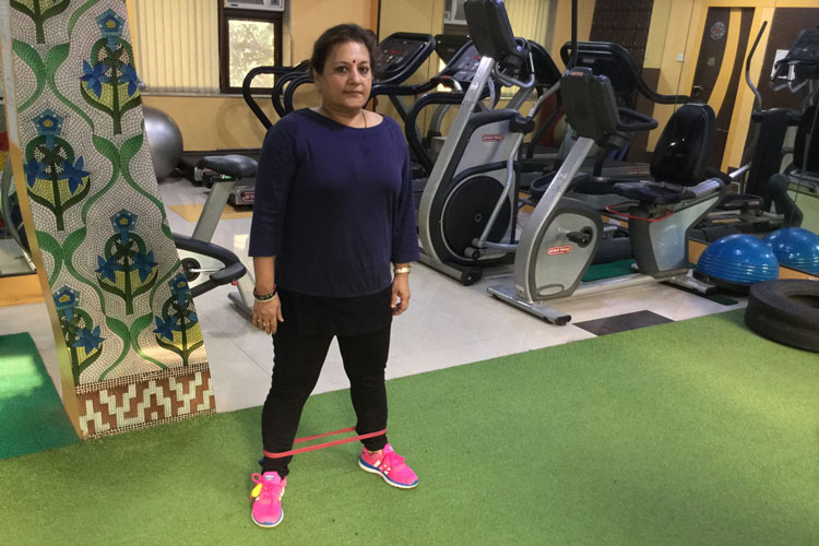 টারমিনাল নি এক্সটেনশন: গোল রাবারের একটা ব্যান্ড জোগাড় করুন (ছবির মতো)। অত্যন্ত সস্তা। কোনও একটা আঙটা বা গ্রিলে ব্যান্ডটা লাগিয়ে একটা পা ওতে গলিয়ে দিন। ঠিক হাঁটুর কাছে। এবারে অন্য পা-টা পিছনে নিন। যে পায়ে ব্যান্ড লাগানো, সেই হাঁটু ভাঁজ করুন আর সোজা করুন। দু’পায়ে ১২ বার করে। এতে থাইয়ের পেশির জোর বাড়ে।