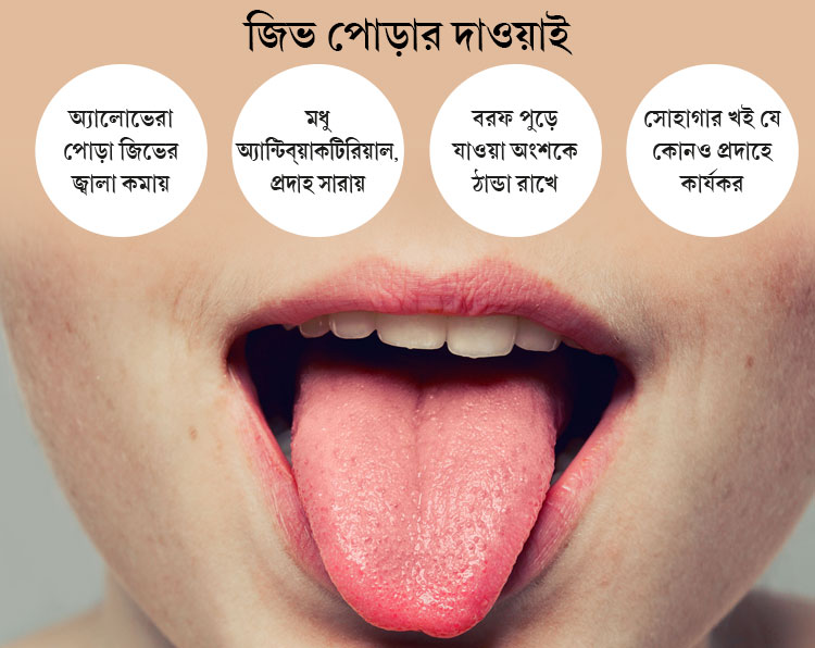 বরফ: বরফ রাখুন জিভের পুড়ে যাওয়া অংশে। এতে ঠান্ডা অনুভূতি হবে ও প্রদাহ সারবে দ্রুত। বরফ একান্তই না পেলে ঠান্ডা জলে কুলকুচি করুন বার কয়েক।