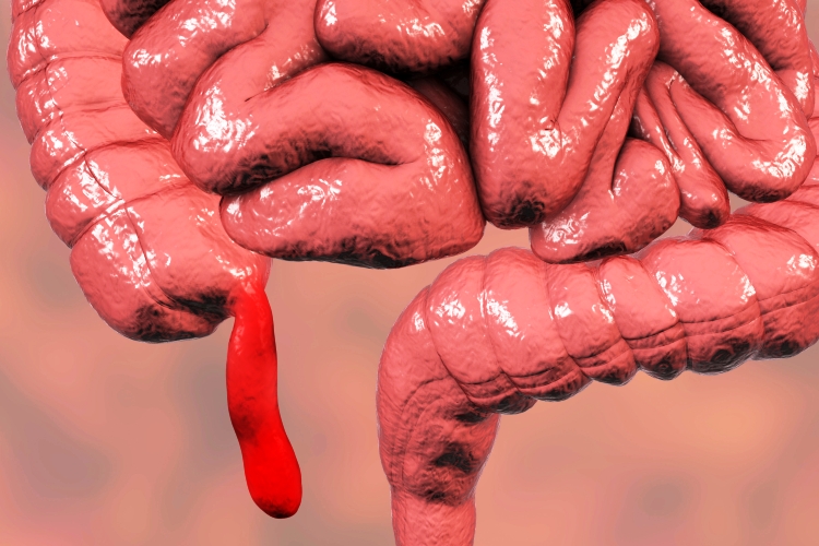 বৃহদন্ত্রের সঙ্গে লেগে থাকা এই লাল থলির মতো অংশই অ্যাপেনডিক্স। ছবি: শাটারস্টক।