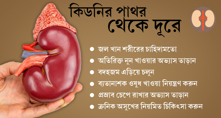 অসুখজনিত সমস্যা: সাধারণ স্টোন ছাড়াও অক্সালেট স্টোন, ইউরিক অ্যাসিড স্টোন, মেয়েদের ক্ষেত্রে স্ট্রভাইট স্টোন হয়। এ সব অসুখজনিত কারণে স্টোন এড়াতে অসুখের নিয়মিত চেক আপ, নিয়ম মেনে ওষুধ ও খাদ্যগ্রহণ করুন। বারবার মূত্রনালীতে সংক্রমণ থেকে হওয়া স্ট্রভাইট স্টোন এড়াতে চেষ্টা করুন নিয়ম মেনে সংক্রমণের চিকিৎসা করাতে।