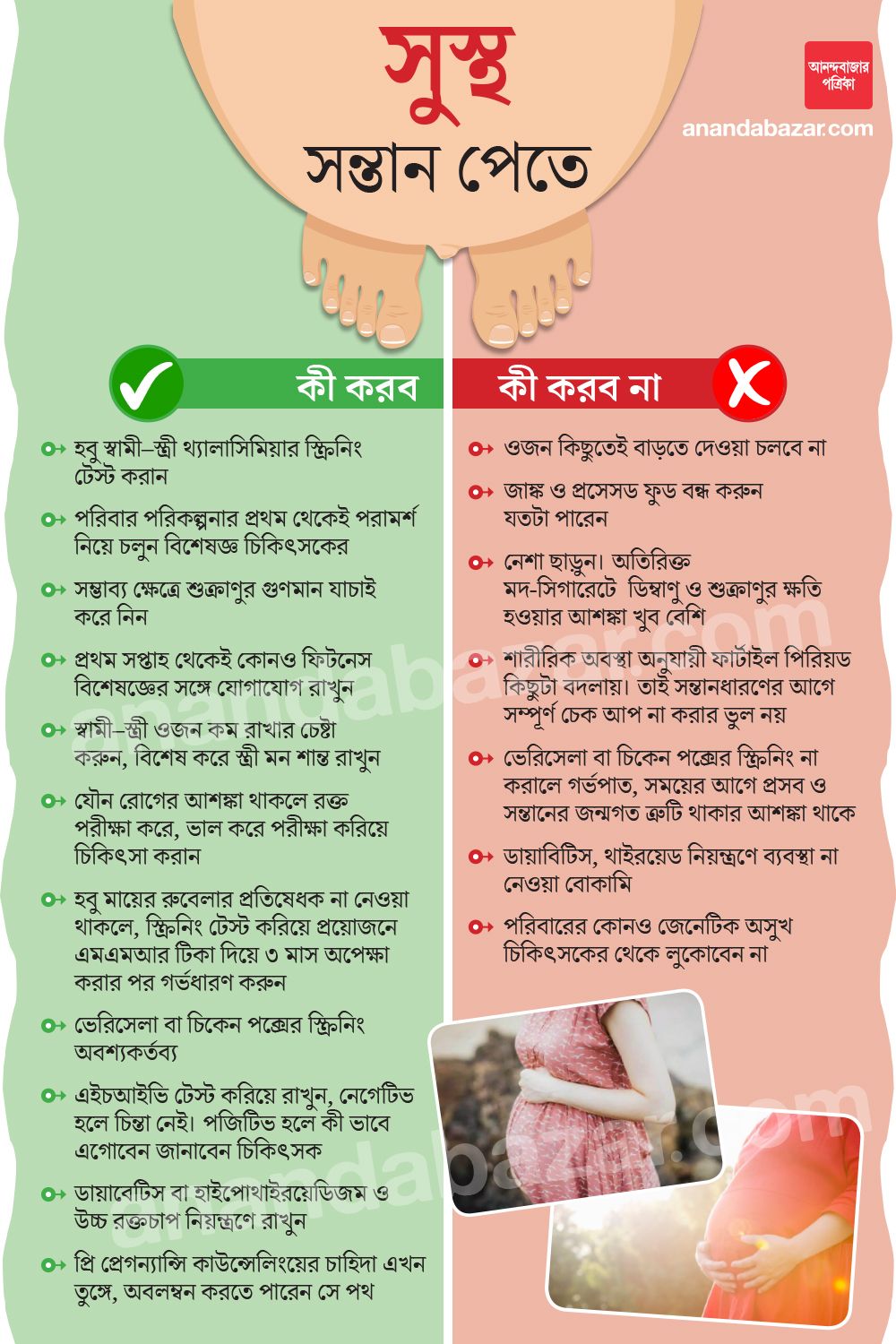 প্রথম থেকেই কিছু রোগ সম্পর্কে ও গর্ভধারণ করতে গেলে সে সব কোনও সমস্যা তৈরি করবে কি না, সে সব জেনে রাখলে প্রাথমিক বিপদ অনেকটা কাটানো যায়। জেনে রাখা ভাল, সুস্থ সন্তান পেতে গেলে কী কী করবেন, কী কী কাজে থাকবে নিষেধাজ্ঞা— রইল সে সবের হদিশ।