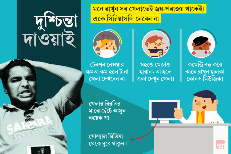 প্রথমেই মনে রাখুন, এটা খেলা। খেলা কিন্তু খেলাই হয়। আর সব খেলাতেই জয়-পরাজয় থাকেই। এতে জাত্যাভিমান, স্বদেশপ্রীতির মতোই ভারী শব্দ মেশাবেন না। এই সচেতনতা সব চেয়ে আগে প্রয়োজন। টেনশন নেওয়ার ক্ষমতা কম হলে, বা হৃদরোগ থাকলে গোটা খেলা না দেখে, মাঝেমধ্যে উঁকি মারুন স্কোরবোর্ডে। আজকাল নানা ওয়েবসাইট স্কোর বোর্ড দেখায়। সেখানেই চোখ রাখুন। খেলা দেখাকালীন অনেকেই সময় কাটাতে বা টেনশন ভুলতে চিপস, ঠান্ডা পানীয় বা প্যাকেট করা পপকর্নে মাতেন। এই ভুল একেবারেই নয়। এ সব খাবার টেনশন তো কমায়ই না, উল্টে শরীরের ক্ষতি করে। বরং খেলার বিরতির মাঝে হেঁটে আসুন কয়েক পা। বাড়ির অন্য কাজ নিয়ে আলোচনা করুন। মাথার মধ্যে একই বিষয় বয়ে বেড়ালে তা মানসিক উদ্বেগ বাড়ায়।