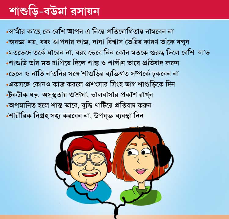 সব সময় মনে রাখবেন, আপনি আপনার স্বামীর জীবনে গুরুত্বপূর্ণ মানুষ হলেও তিনি তাঁর মা। সুতরাং তাঁর সঙ্গে সম্পর্কের ধারেভারে প্রতিযোগিতায় নামাটা বোকামি। বরং শাশুড়ির প্রতি আপনার সম্মান শ্বশুরবাড়িতে আপনার জায়গাটিকেই আরও মজবুত করবে। চেষ্টা করুন, আপনার ভাইয়ের বউ আপনার মায়ের সঙ্গে ঠিক কেমন ব্যবহার করলে আপনি খুশি হতেন,সেটা ভাবতে, চেষ্টা করুন সেই কাজ নিজেও করতে। শাশুড়ি আগের প্রজন্মের মানুষ। হয়তো চাকরিও করতেন না। তাই নানা কাজে মতবিরোধ থাকতেই পারে। বিশ্বাস ও আদর্শ নিয়েও সংঘাত আসতে পারে। আপনার কাজের ক্ষেত্রটিও হয়তো তিনি তেমন বোঝেনই না, সে ক্ষেত্রে অবজ্ঞা না করে বরং কয়েক দিন গল্পের ছলে আপনার কাজ, নানা বিশ্বাস তৈরির কারণ তাঁকে বলুন। আধুনিক পৃথিবীতে কোথায় কী ঘটছে, কেনই বা এমন ঘটনা হটাৎ ঘটল এ সব নিয়েও কথা বলুন তাঁর সঙ্গে। মনোবিদদের মতে, প্রথম প্রথম না শুনতে চাইলেও আপনার আগ্রহের প্রভাবে তাঁর আগ্রহ ধীরে ধীরে বাড়বে। এর পরেও সরাসরি কোনও মতভেদ ঘটলে তর্কে যাবেন না। তাতে কোনও সমাধান হয় না। তর্কে হেরে কেউ তাঁর নিজের মত বদলান না। সুতরাং ওই পথ ত্যাগ করুন। বরং ভেবে নিন কোন মতকে গুরুত্ব দিলে পরিবারের সকলেরই লাভ হবে। দরকারে শাশুড়ির সঙ্গেও এই শান্ত আলোচনাটা চালান।