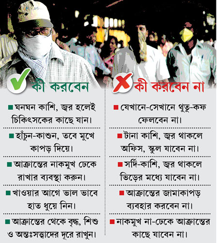 রাজ্য সরকারের তরফে সচেতনতা প্রচার না হলেও পরজীবী বিশেষজ্ঞেরা বলছেন, জনবহুল এলাকায় সোয়াইন ফ্লু-র জীবাণু দ্রুত ছড়ায়। বাতাসের সঙ্গে, কিংবা আক্রান্তের কফ-থুতুর সঙ্গে মিশে এই রোগের ভাইরাস অন্যের শরীরে ঢোকে। তাই সর্দি-কাশি, জ্বর, শ্বাসকষ্ট বা গলাব্যথার উপসর্গ থাকলে সংশ্লিষ্ট ব্যক্তির বাজার বা স্কুল-কলেজের মতো জনবহুল জায়গায় না যাওয়াই উচিত। বিশেষজ্ঞদের মতে, খুব বেশি জ্বর না থাকলেও নিশ্চিন্ত হওয়ার কিছু নেই। বরং গা ম্যাজম্যাজে ভাব, সর্দি-কাশিতেও সতর্ক থাকা বাঞ্ছনীয়।