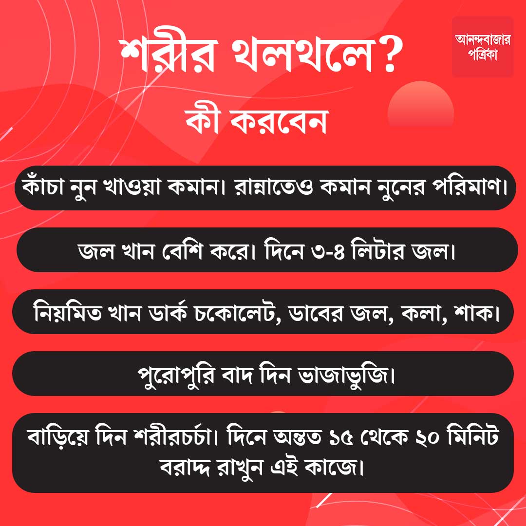 কী করে এই থলথলে ভাব কমাবেন? কী করে কমাবেন শরীরের ধরে রাখা জলের পরিমাণ? জেনে নিন।