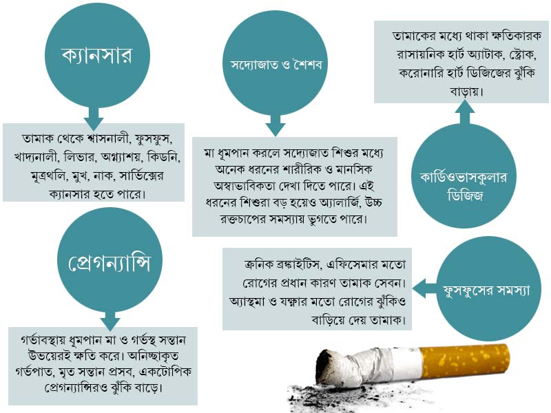 ধূমপান স্বাস্থ্যে পক্ষে ক্ষতিকারক। সিনেমা হল থেকে সিগারেটের প্যাকেট, এই বিধিবদ্ধ সতর্কীকরণ আটকে রয়েছে শুধু নিয়মেই। সতর্কীকরণে শুধু ফুসফুসের ছবি থাকলেও শরীরের এমন কোনও অঙ্গ নেই যা ধূমপানে ক্ষতিগ্রস্ত হয় না। হার্ট, রক্তনালী, ফুসফুস, চোখ, মুখ, জননতন্ত্র, হাড়, ব্লাডার ও পৌষ্টিকতন্ত্র সব কিছুর উপরেই ধূমপানের প্রভাব পড়ে। বিশ্ব স্বাস্থ্য সংস্থার রিপোর্ট বলছে, প্রতি বছর বিশ্বে তামাকের জন্য ৬০ লক্ষ মানুষের মৃত্যু হয়। এর মধ্যে ৫ লক্ষ মানুষের মৃত্যু হয় সরাসরি ধূমপানের কারণে। নিজেরা ধূমপান না করেও পরোক্ষ ভাবে ধূমপানের কারণে মৃত্যু হয় ৬ লক্ষেরও বেশি মানুষের। হিসেব অনুযায়ী, প্রতি ৬ সেকেন্ডে এক জন মানুষের মৃত্যুর কারণ- তামাক।