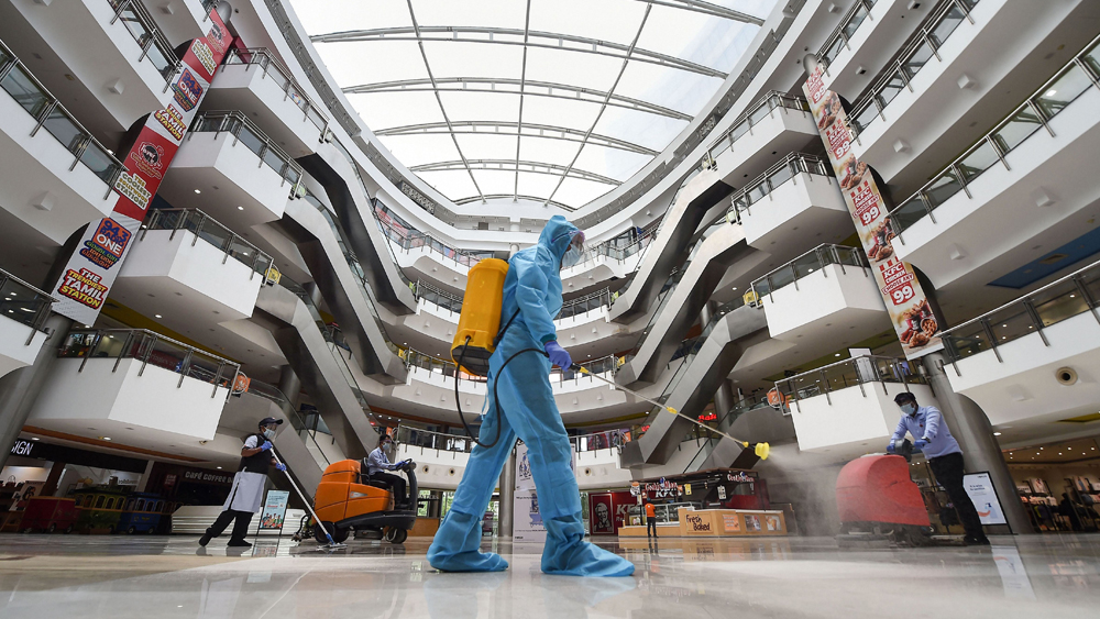 শপিং মলের প্রবেশদ্বারে নিয়ন্ত্রণ রাখা প্রয়োজন। জরুরি নিয়মিত স্যানিটাইজেশনের। ছবি:পিটিআই
