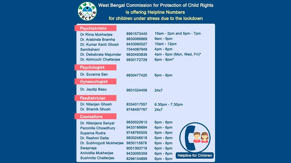 কমিশনের ওয়েবসাইট এবং ফেসবুক পেজে দেওয়া রয়েছে একাধিক চিকিৎসক এবং মনোবিদদের ফোন নম্বর। শিশু সংক্রান্ত যে কোনও সমস্যায় তাঁরা সাহায্য করতে প্রস্তুত। এ প্রসঙ্গে কমিশনের চেয়ারপার্সন অনন্যা চক্রবর্তী বুধবার বলেন, “এই সময় শিশুদের মানসিক স্বাস্থ্যের বিষয়টিও আমরা খেয়াল রাখছি। আমরা যে চিকিৎসক এবং মনোবিদদের নম্বর প্রকাশ করেছি, তাঁদের সঙ্গে যে কেউ ফোন করে যোগাযোগ করতে পারেন। তাঁদের পরামর্শ মেনে চলুন।”