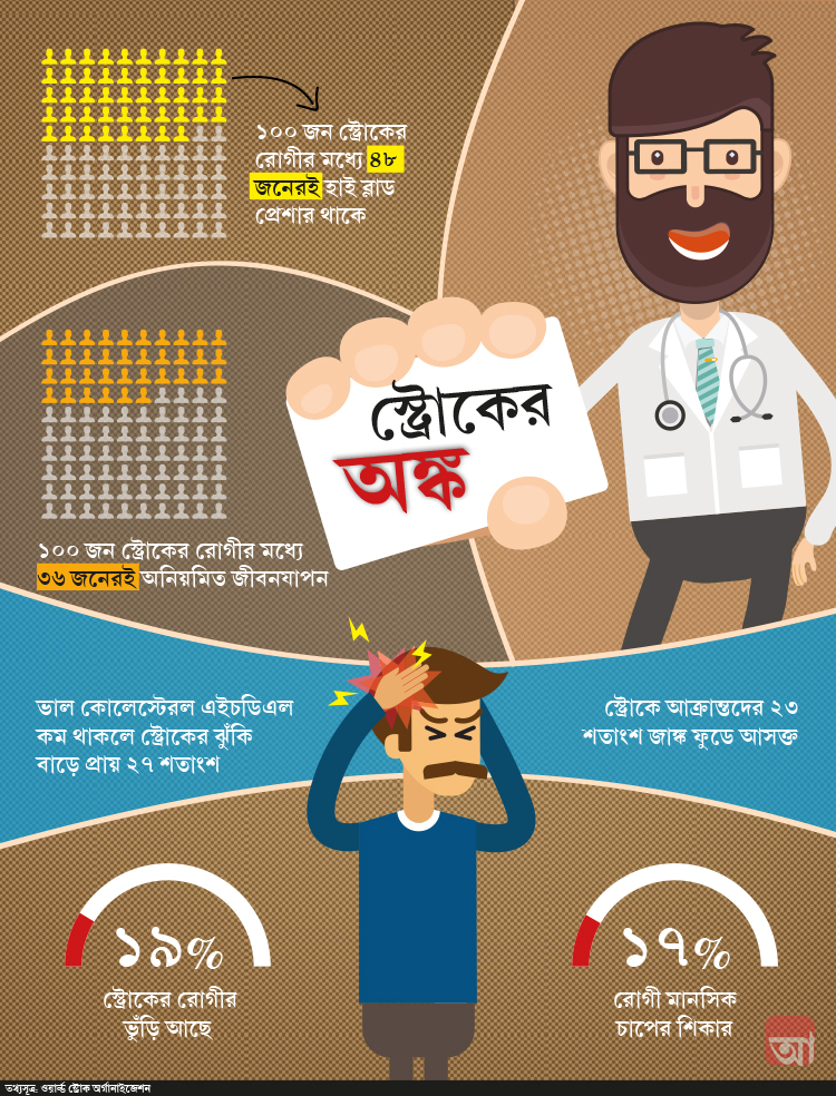 মস্তিষ্কে রক্ত চলাচল বন্ধ হওয়ার অন্যতম প্রধান কারণ উচ্চ রক্তচাপ। বিশেষ করে অনিয়ন্ত্রিত রক্তচাপ থাকলে স্ট্রোকের ঝুঁকি বাড়ে। ওয়ার্ল্ড স্ট্রোক অর্গানাইজেশন-এর সমীক্ষা অনুযায়ী, প্রতি ১০০ জন রোগীর মধ্যে ৪৮ জনেরই হাই ব্লাড প্রেশার থাকে। প্রেশারের ওষুধ নিয়ম করে না খেলে প্রেশার বেড়ে গিয়ে আচমকা স্ট্রোকের ঝুঁকি বেড়ে যায়। যাঁদের সারা দিন চেয়ারে বসে কাজ করতে হয়, হাঁটাচলা-সহ কায়িক পরিশ্রম তেমন নেই বললেই চলে, তাঁদের এই রোগের ঝুঁকি অন্যদের থেকে বেশি। সমীক্ষায় জানা গিয়েছে, ১০০ জন স্ট্রোকের রোগীর মধ্যে ৩৬ জনেরই জীবনশৈলীতে তেমন কোনও নিয়ম মানার ‘নিয়ম’ নেই। যাঁদের রক্তে কোলেস্টেরলের পরিমাণ স্বাভাবিকের তুলনায় বেশি, তাদেরও স্ট্রোকের সম্ভাবনা বেশি। প্রসঙ্গত এলডিএল ও ভিএলডিএল কোলেস্টেরল ও ট্রাইগ্লিসারাইডের মাত্রাধিক্য এবং ভাল কোলেস্টেরল এইচডিএল কম থাকলে স্ট্রোকের ঝুঁকি বাড়ে প্রায় ২৭ শতাংশ। সহজপাচ্য সুষম খাবারের পরিবর্তে ভাজাভুজি, জাঙ্ক ফুড বেশি খেলে আচমকা স্ট্রোক আক্রান্ত হওয়ার সম্ভাবনা বাড়ে। দেখা গিয়েছে যে, স্ট্রোকে আক্রান্তদের ২৩ শতাংশ এই ধরনের খাবারে আসক্ত। সেন্ট্রাল ওবেসিটি অর্থাৎ ভুঁড়ি থাকলে আচমকা ব্রেন স্ট্রোক হতে পারে। ১৯ শতাংশ স্ট্রোকের রোগীর সেন্ট্রাল ওবেসিটি আছে। মানসিক চাপ স্ট্রোকের ঝুঁকি বাড়ায়। স্ট্রেস ও ডিপ্রেশন-সহ অন্যান্য মানসিক সমস্যা থাকলেও এই সমস্যার সম্ভাবনা থাকে। স্ট্রোকের রোগীদের ১৭% মানসিক চাপের শিকার। ধূমপানে আসক্তি অন্যান্য অনেক অসুখের সঙ্গে সঙ্গে স্ট্রোকের ঝুঁকিও বাড়ায়। মদ্যপানে স্ট্রোকের ঝুঁকি বাড়ে। হার্টের অসুখ থাকলে ব্রেন স্ট্রোকের ঝুঁকি বেশি। যাঁরা ডায়াবিটিসে ভুগছেন ও ডায়েট বা শরীরচর্চা করেন না, তাঁদেরও স্ট্রোকের সম্ভাবনা অনেক বেশি। লক্ষ করলে দেখবেন, স্ট্রোকের প্রায় প্রতিটা রিস্ক ফ্যাক্টরকেই কিন্তু নিয়ন্ত্রণ করা সম্ভব। বিশেষ করে ব্লাড প্রেশার ও সুগার থাকলে নিয়মিত চেক আপ ও শরীরচর্চা করা দরকার। ওজন ঠিক রাখতে হবে। বাইরের খাবার ও ফাস্ট ফুড এড়িয়ে পুষ্টিকর সহজপাচ্য খাবার খাওয়া দরকার।