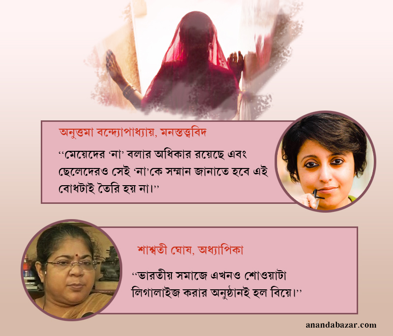 নারীর অধিকারের প্রসঙ্গ যত বেশি বেশি করে উচ্চারিত হয়েছে দেশে দেশে, ততই প্রাসঙ্গিক হয়ে উঠেছে এই প্রশ্ন। কনসালটেন্ট সাইকোলজিস্ট অনুত্তমা বন্দ্যোপাধ্যায়ের কথায়, ‘‘ভারতীয় সমাজের মানসিকতায় কোথাও এখনও এই সাবেকি ধারণা রয়েছে যে, বিয়ে করা মানেই সম্মতি নিয়ে যৌন সম্পর্কের আর প্রয়োজন নেই। মেয়েদের ‘না’ বলার অধিকার রয়েছে এবং ছেলেদেরও সেই ‘না’কে সম্মান জানাতে হবে এই বোধটাই তৈরি হয় না। বেশির ভাগ ক্ষেত্রে এখনও অ্যারেঞ্জড ম্যারেজে মেয়েরা শারীরিক সম্পর্কের প্রস্তুতির সময়টুকুও পান না। লভ ম্যারেজেও সমস্যা আসতে পারে। তবে তখন সেই ধর্ষণটা অনেক ক্ষেত্রেই রাগের বহিঃপ্রকাশ। যৌনতার নয়। সবচেয়ে মর্মান্তিক এক্ষেত্রে সামাজিক সাপোর্টের জায়গা থাকে না। মেয়েটি তার আত্মীয়দের কাছে বিষয়টি বললেও তাঁকে হয়তো শুনতে হয়, তোর তো বিয়ে হয়ে গিয়েছে। এখন এটাই স্বাভাবিক। বৈবাহিক ধর্ষণ তাই কোথাও বিবাহ প্রতিষ্ঠানটার মধ্যে মান্যতা পেয়ে গিয়েছে। যৌন সচেতনতার অভাবে এটা অনেকে বুঝতেই পারেন না, কোনও সম্পর্কে বলপূর্বক ঘনিষ্ঠতা কখনও আদর নয়। আর তা হলে দু’জনের কেউই প্রত্যাশিত আনন্দ পাবেন না।’’
