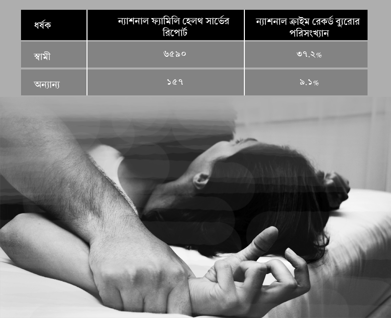 ন্যাশনাল ফ্যামিলি হেলথ সার্ভের তরফে পঞ্জাব, হরিয়ানা, উত্তরপ্রদেশ, রাজস্থান, গুজরাত, মহারাষ্ট্র, মধ্যপ্রদেশ, ওড়িশাতে ১৮-৪৯ বছর বয়সী মহিলাদের ওপর একটি সমীক্ষা করা হয়েছিল। সেই ফলাফলের সঙ্গে ন্যাশনাল ক্রাইম রেকর্ড ব্যুরোর পরিসংখ্যানকে মিলিয়ে গবেষণা করে একটি রিপোর্ট পেশ করেছেন সমাজবিজ্ঞানী আশিষ গুপ্ত। সেখানে দেখা যাচ্ছে প্রতি এক লক্ষ মহিলার মধ্যে ৬৫৯০জন সমীক্ষকদের কাছে স্বামীর দ্বারা ধর্ষণের ঘটনা স্বীকার করেছেন।