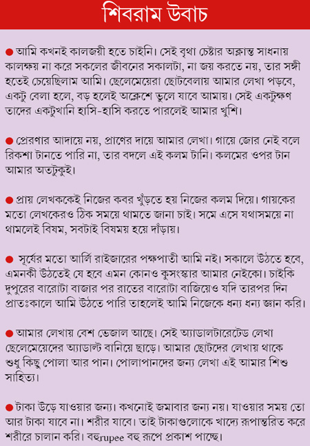 কেউ যদি কখনও এসে বলতেন, শিবরামদা আপনার নামে অমুকে খারাপ কথা বলে বেড়াচ্ছেন, সঙ্গে সঙ্গে শিবরামের উত্তর, ‘‘হতেই পারে না। আপনিই ভুল শুনেছেন।’’ বলেই তার হাত ধরে নিয়ে যেতেন খাওয়াতে। নিজেকে সাহিত্যিক পরিচয় দিতেও সংকোচ। বলতেন, ‘‘ধুর ধুর আমি আবার সাহিত্যিক হলাম কবে? প্রেমেন, অচিন্ত্য, শরৎচন্দ্র, বিভূতিভুষণ এরা হলেন সাহিত্যিক। কত ভাল ভাল লেখেন! তাদের পাশে আমি!’’