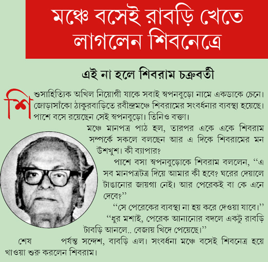 সুনীল গঙ্গোপাধ্যায় তখন আনন্দবাজার-এ চাকরি করেন। একদিন বেলার দিকে এক সাহিত্যিক এসে খবর দিলেন শিবরামবাবুকে দেখলাম, অফিসের কাছেই ফুটপাথে চিৎ হয়ে শুয়ে আছেন। মনে হয় শরীরটরির...!’’