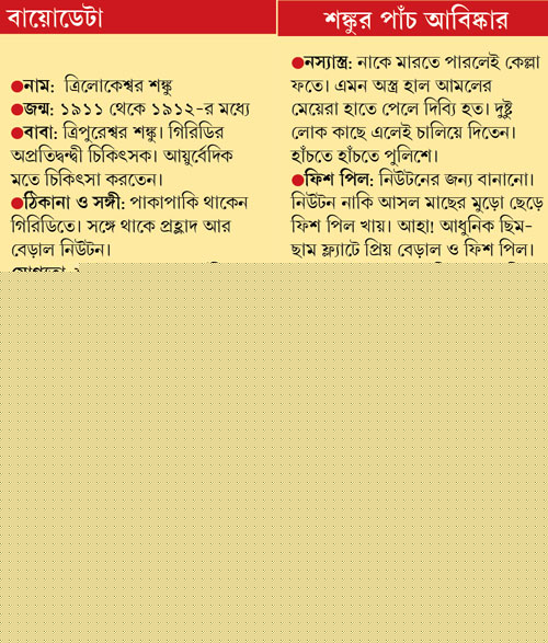 গিরিডিনিবাসী ত্রিলোকেশ্বর শঙ্কু। সত্যজিতের প্রিয় চরিত্রগুলোর মধ্যে প্রবীণতম। ‘স্বর্ণপর্ণী’ গল্পে শঙ্কুর যে আত্মজীবনকথা আছে, সেই অনুসারে হিসেবনিকেশ করলে দেখা যাবে তিনি ১৯১১-১২ সাল নাগাদ জন্মেছিলেন ।