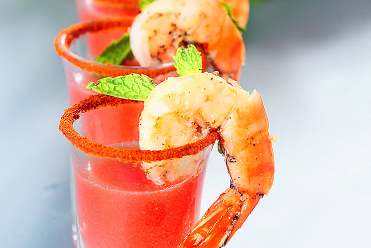 উপকরণ: চিংড়ি ২০০ গ্রাম, একস্ট্রা ভার্জিন অলিভ অয়েল ১ টেবিল চামচ, টম্যাটো জুস ২ কাপ, সোডা ওয়াটার ১ কাপ, উরস্টারশায়ার সস ১ টেবিল চামচ, হট সস ২ চা চামচ, পাতিলেবু ১টি, পুদিনা পাতা ও লঙ্কার গুঁড়ো সাজানোর জন্য।