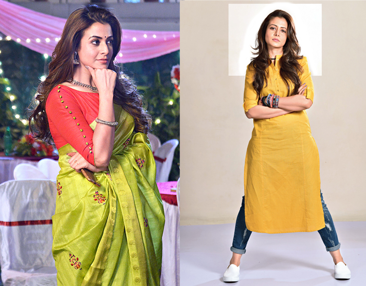 ছবির চরিত্র নিয়ে কোয়েল বললেন, ‘‘লাবণ্যকে সবাই বলে, শাড়ি পরলে ওকে সুন্দর দেখায়। কিন্তু ও হল গেছো! ফাটা জিন্স পরে ঘুরে বেড়ায়!’’ তবে ফাটা জিনস বা ‘রিপ্ড জিনস’ গত দুই সিজন ধরে ভীষণ ইন। তাকেই স্টাইল করুন নানা ভাবে, মর্জি অনুযায়ী। ক্যাজুয়াল মেজাজে থাকলে লং সিল্যুয়েটের কুর্তির সঙ্গে ফুল লেংথ জিন্স একটু গুটিয়ে পরে নিন। যেমন কোয়েল পরেছেন। কিংবা স্টাইল করুন ব্যাগি টি-শার্টের সঙ্গে। এখন বিভিন্ন রকম রং ও মেটিরিয়ালের কেপ জনপ্রিয়। মিক্স অ্যান্ড ম্যাচের ইচ্ছে হলে, সলিড কালারের ট্যাঙ্ক টপের সঙ্গে রিপ্ড জিন্স আর টাই অ্যান্ড ডাই বা ইক্কতের কেপ পরে নিলে আপনি সুপার স্টাইলিশ! আর সাহসী হওয়ার মুড হলে জিনস-টিশার্টের কম্বিনেশনে উজ্জ্বল একরঙা শাড়ি জড়িয়ে নিন। সঙ্গে সাদা কেডস। এখানে কোয়েল পরেছেন ফুশিয়া র-সিল্কের শাড়ি। আপনি লেমন ইয়েলো, পিকক ব্লু বা এমারেল্ড গ্রিনও পরতে পারেন। তবে টি-শার্টের রং মানানসই হতে হবে।