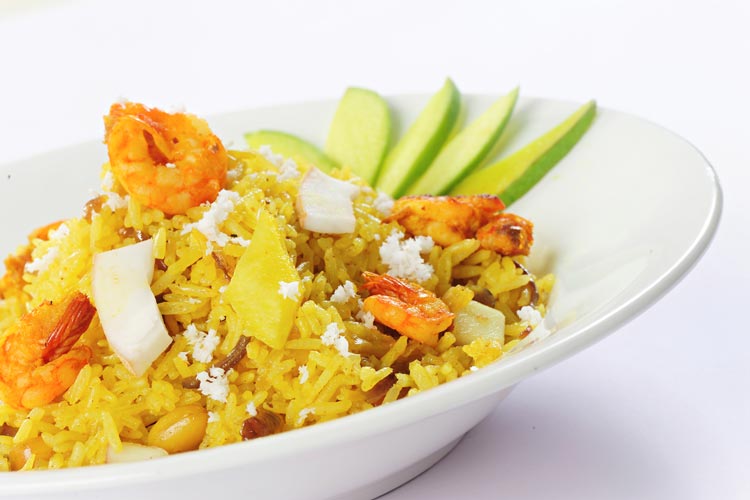 উপকরণ: গোবিন্দভোগ চাল ১০০ গ্রাম, চিংড়ি ১৫০ গ্রাম, কাঁচা আম ১টি, চিনে বাদাম ২ টেবিল চামচ, পেঁয়াজ কুচি