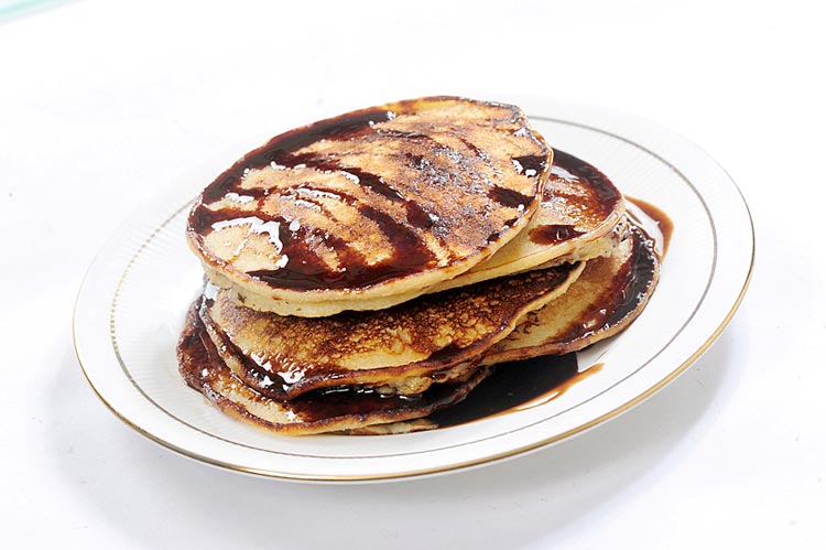 উপকরণ: ওট্স ১ কাপ (গুঁড়ো করা), আটা আধ কাপ, বেকিং পাউডার ১ চা চামচ, দারচিনি গুঁড়ো এক চিমটি, ব্রাউন সুগার ৪ টেবিল চামচ, টক দই আধ কাপ, দুধ প্রয়োজন মতো, নুন সামান্য, মাখন ভাজার জন্য, চকলেট সিরাপ আধ কাপ, মধু ৩ টেবিল চামচ।