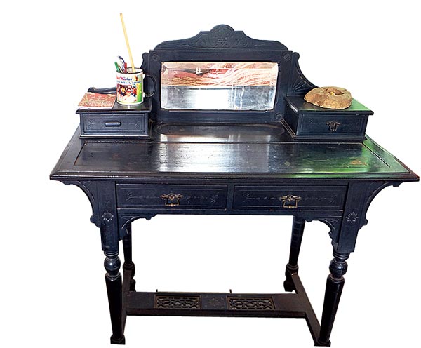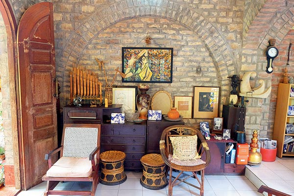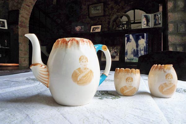 রান্নাঘরের দিকে কাঠের আলমারিতে রান্না ও খাবারের নানা সরঞ্জাম। সেখান থেকেই আশ্চর্য প্রদীপের মতো বেরিয়ে এল ইন্দিরা দেবী চৌধুরানির ছবি দেওয়া টি সেট। দূরে পারিবারিক ছবিতে জ্ঞানদানন্দিনীর কোলে সুপ্রিয় ঠাকুর। একতলার খাওয়ার ঘর থেকে শোওয়ার ঘর আলাদা করা হয়েছে পুরনো পিয়ানো দিয়ে। বাড়ির মধ্য দিয়েই সিঁড়ি। সিঁড়ির ধাপে ধাপে ডোকরার ঘোড়া, পেঁচা ও আরও নানা মুখ। মাঝসিঁড়িতে ছিমছাম গেস্টরুম কটকি পরদায় সেজেছে। তাকে ছাড়িয়ে উপরে যাওয়ার সিঁড়ির দেওয়াল জুড়ে বইয়ের তাক। মনে হবে, বিশ্বলোকের ওখানেই শুরু, ওখানেই শেষ। সে দিক ছাড়ালেই খোলামেলা বারান্দা। পুরো আকাশ দেখার ব্যবস্থা। আর তার উল্টো দিকেই শোওয়ার ঘর। এ বাড়ির প্রতিটি ঘরের সঙ্গেই লাগোয়া বারান্দা। ছড়িয়ে ছিটিয়ে বেতের মোড়া, যার উপর পেতলের থালা রেখে, সাইড টেব্ল হিসেবে ব্যবহৃত। শোওয়ার ঘরে ঢুকতেই চোখ যায় আয়না দেওয়া কালো টেব্লে। ‘‘ওই টেব্লেই রবীন্দ্রনাথ লিখতেন,’’ ভেসে এল শুভ্রা ঠাকুরের স্বর।