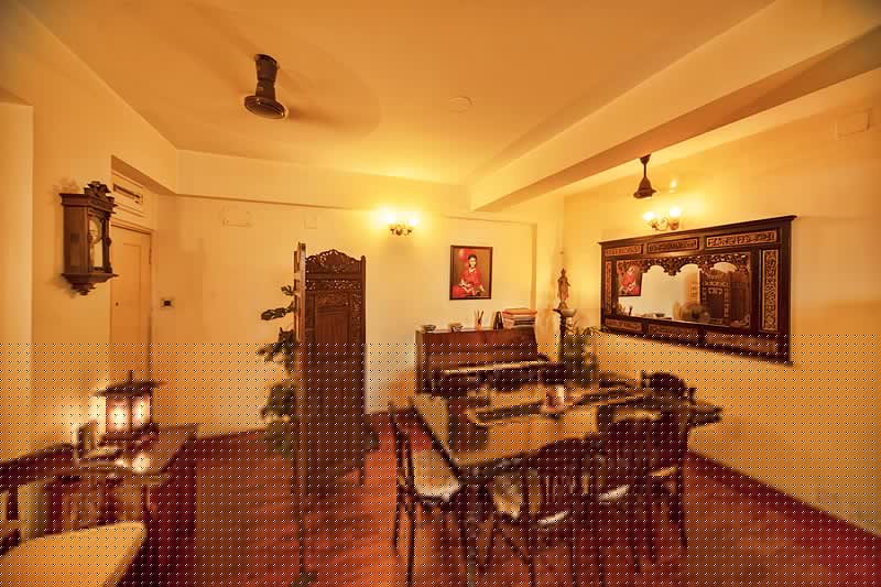 একতলার ড্রয়িংরুমের যে দিকে তাকাই, সেখানেই চোখ যেন দু’ দণ্ড শান্তি পেতে চায়। তুরস্ক থেকে আনা কার্পেট বা তুর্কমেনিস্তান থেকে রাগ-এর জমকালো শোভা ব্যালান্সড হয়েছে হালকা ঘিয়ে রঙা দেওয়ালে ও সোফার কভারের রঙে। সোফার পাশে রাখা ইন্দোনেশিয়া থেকে আনা মেটালের গরুর মূর্তি, কম্বোডিয়ার হর-পার্বতীর শিল্পসুষমা পূর্ণাঙ্গ। এ বাড়িতে রাখা বিভিন্ন চেয়ার, ক্যাবিনেট, কাঠের পার্টিশনও এসেছে আকাশপথে পাড়ি দিয়ে।