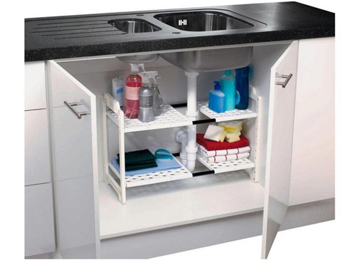 • সিঙ্কের নীচের অংশ অব্যবহৃত থাকে। সেই জায়গায় বানিয়ে ফেলুন ছোট্ট র্যাক। তাতে রাখুন রোজকার প্রয়োজনীয় ব্রাশ, তোয়ালে, ডিশ ওয়াশার সোপ ইত্যাদি।