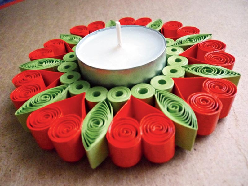 কুইল্ড দিয়া: ঠাকুরঘরে কিংবা আয়নার সামনে মোমবাতির বদলে রাখুন কুইল্ড দিয়া। একটা পুরনো সিডি পরিষ্কার করে মাঝখানে টি-লাইট ক্যান্ডেল বসানোর মতো জায়গা ছেড়ে গোল আঁকুন। কুইলিং নিডলের সাহায্যে হ্যান্ডমেড পেপার দিয়ে বুনে নিন রোজ, টিয়ার ড্রপ, পেটাল জাতীয় মোটিফ। আলপনা দেওয়ার মতোই কুইলিং ডিজাইন তৈরি করুন। এ বার মাঝে একটা টি-লাইট ক্যান্ডেল বসিয়ে দিলেই জমে যাবে মোমবাতির সাজ!